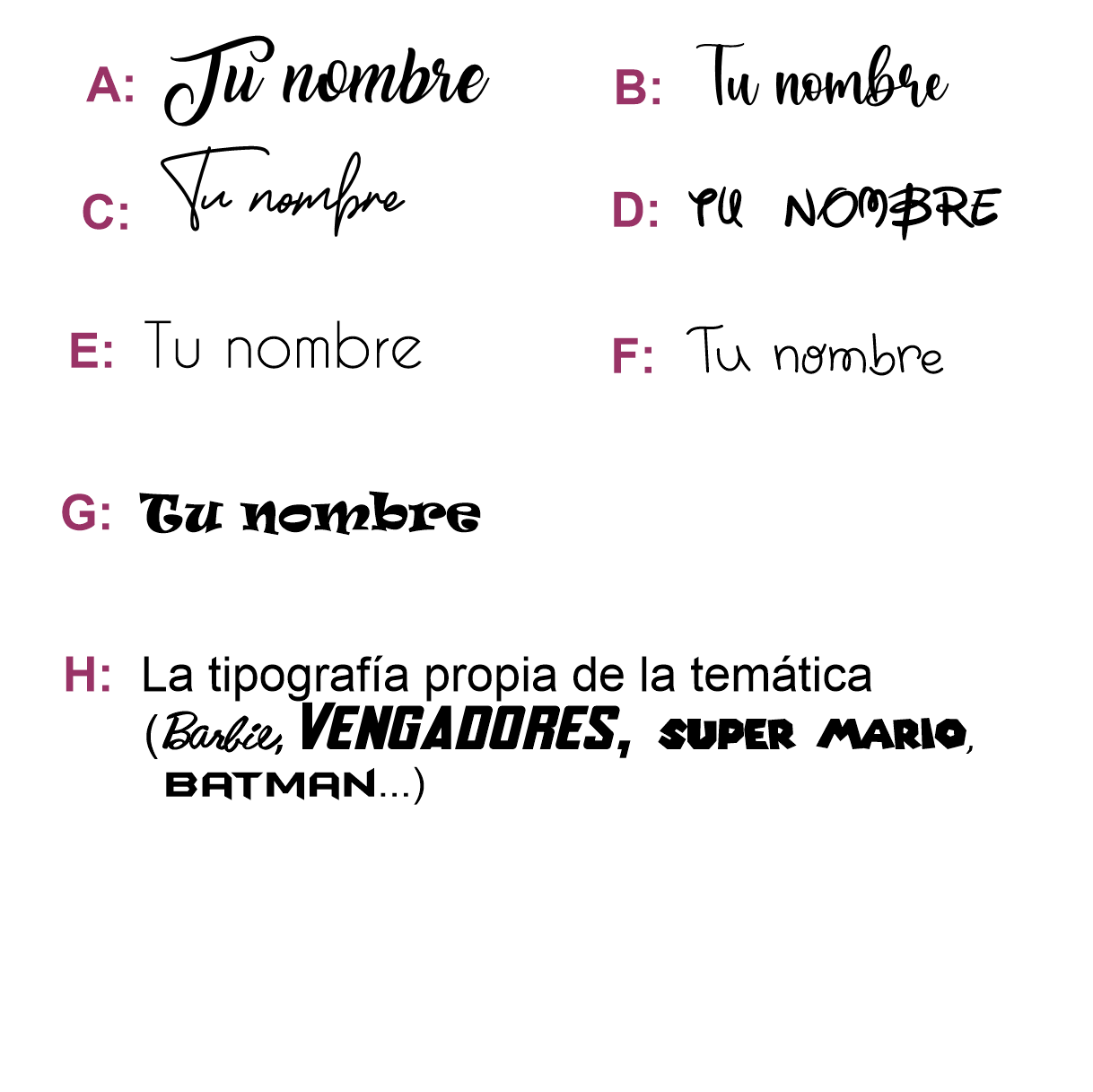 Personalízala a tu gusto. Selecciona el modelo que más te guste, indica el nombre que quieres poner y elige el tipo de letra entre las tipografías que te mostramos en la última foto. Puedes indicarnos en el campo "observaciones" cualquier otra indicación que necesites.
